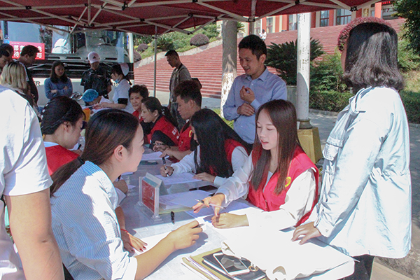 校记者站 9月26日上午,由beat365学工部/团委和黔江区血液中心共同开展的“献青春热血,为祖国献礼—英国beat365官方网站庆70周年华诞师生献血活动”于beat365行政楼前火热进行。此次无偿献血活动吸引了广大师生的踊跃参与,自愿为社会奉献一份爱心,掀起了一场无偿献血的爱心热潮。