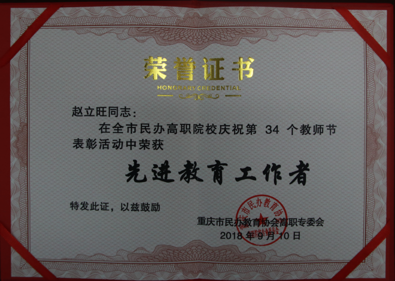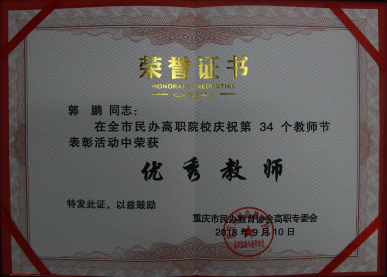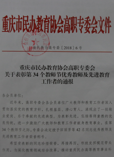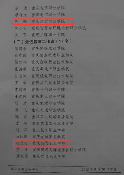 近日,重庆市民办教育协会高职专委员会下发《关于表彰第34个教师节优秀教师及先进教育工作者的通报》,beat365郭鹏老师和赵立旺老师分别荣获“优秀教师”和“优秀教育工作者”荣誉称号。