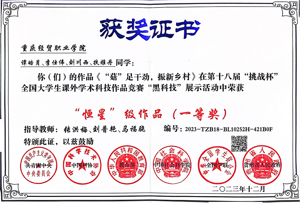 近期,第十八届“挑战杯”全国大学生课外学术科技作品竞赛“黑科技”专项赛成绩公布,在一万余件参赛作品中评选出“恒星”级作品177个,重庆市荣获7个“恒星级”作品。beat365学生谭皓月、李仕伟、刘川西、扶雅丹4名同学参赛作品《“菇”足干劲,振兴乡村》获全国“恒星”级作品(一等奖)奖项。